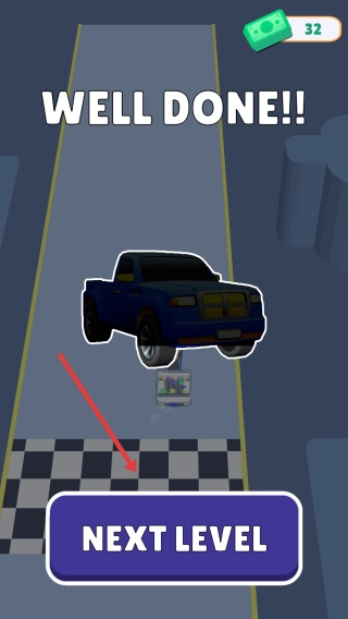 3、顺利通关后,点击“NEXT LEVEL”按钮,即可解锁蓝色皮卡车这一新载具,并进入下一关继续展开竞速挑战。