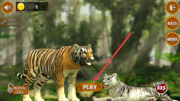 1、进入游戏,点击【PLAY】按钮,选择操控老虎,开启动物模拟冒险,体验丛林或城市生存。
