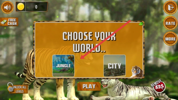 2、于场景选择页面,依据箭头指示选中【JUNGLE】(丛林)场景,接着点击【PLAY】,随即进入丛林环境,开启关卡挑战。
