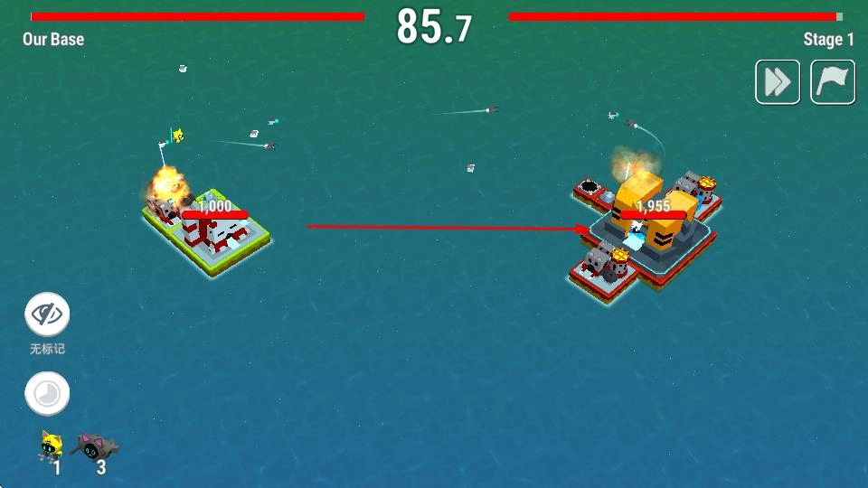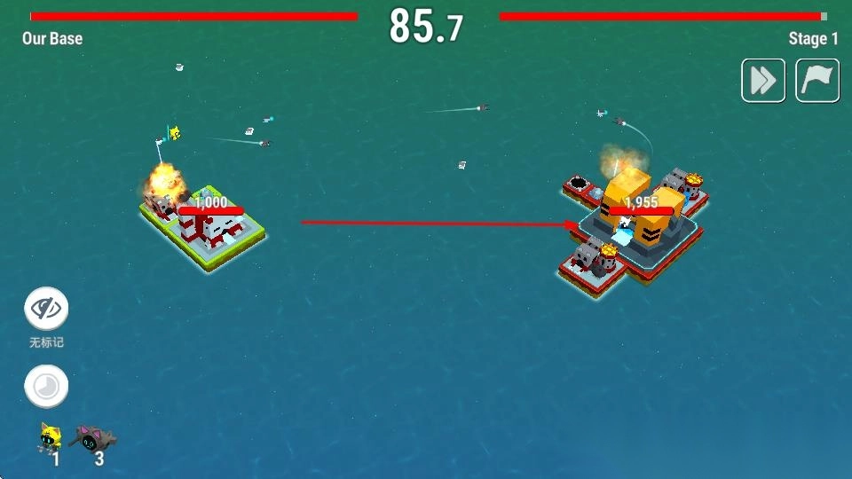 3、进入“Stage1”等战场,派遣无人机部队,攻击敌方基地,摧毁建筑、消耗血量;同时防守己方基地,利用建筑、无人机特性。