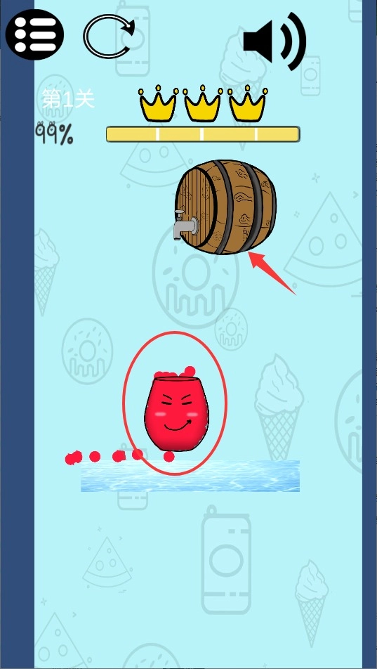 1、进入游戏界面后点击开始按钮,系统将展示不同颜色的酒桶和空酒杯,玩家需观察目标酒液的指定容量。