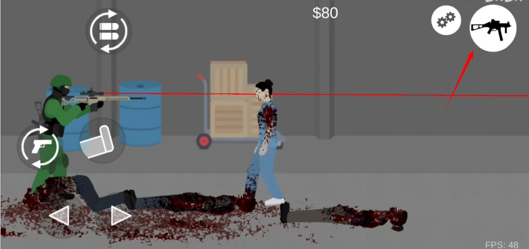 1. 在游戏界面的左侧,设有用于控制玩家左右移动的方向键、切换武器的按键以及踢腿攻击的按键。