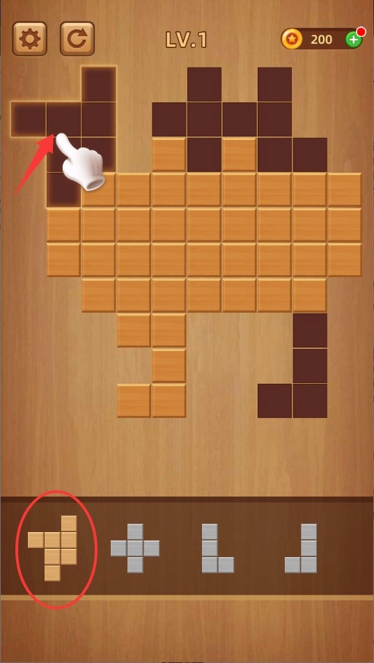 1、进入游戏后选择关卡,通过手指滑动调整底部方块的位置,将其精准放置到上方拼图区域的空缺处。