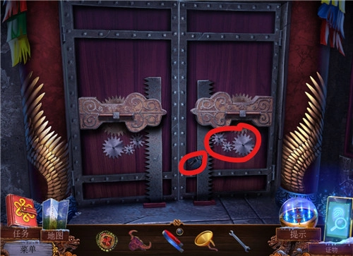 2、赤色门,用雪撬当门闩挡在门后。捡刷子,用刷子刷齿轮,得齿轮。安大门右半边上。