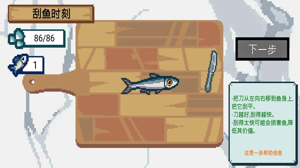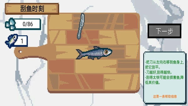 2.刮鱼操作:将刀从左向右移动,确保刀刃接触到鱼身,完成刮鱼任务。