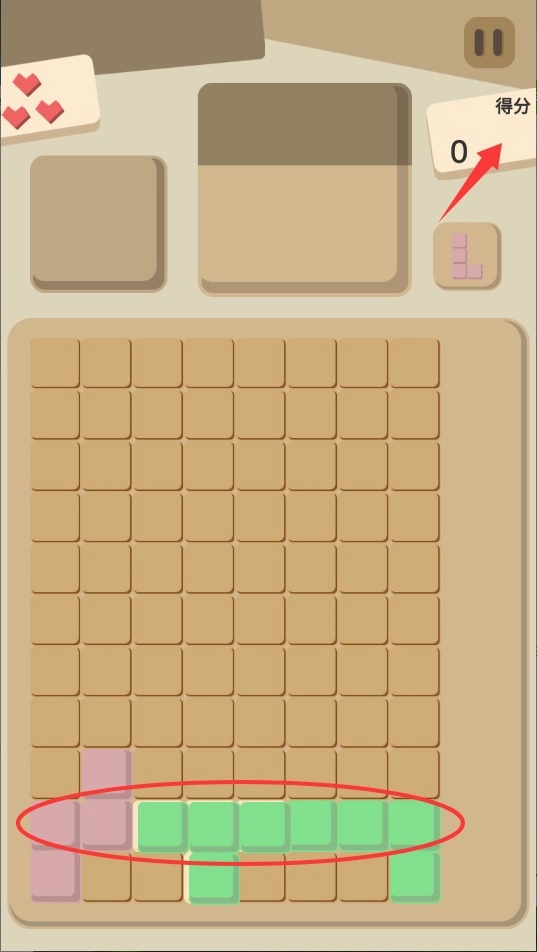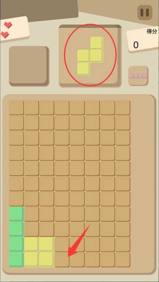 2、通过点击选择方块并滑动到目标位置,注意观察棋盘布局,合理规划每个方块的放置区域。