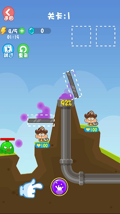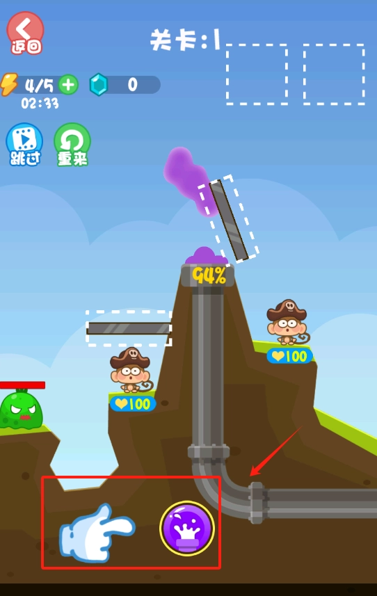 2、点击跳过可略过当前关卡,点击重来则能重新挑战,需留意保护山顶的小海盗,别让绿怪攻击到它。