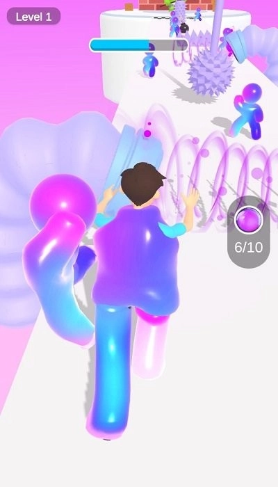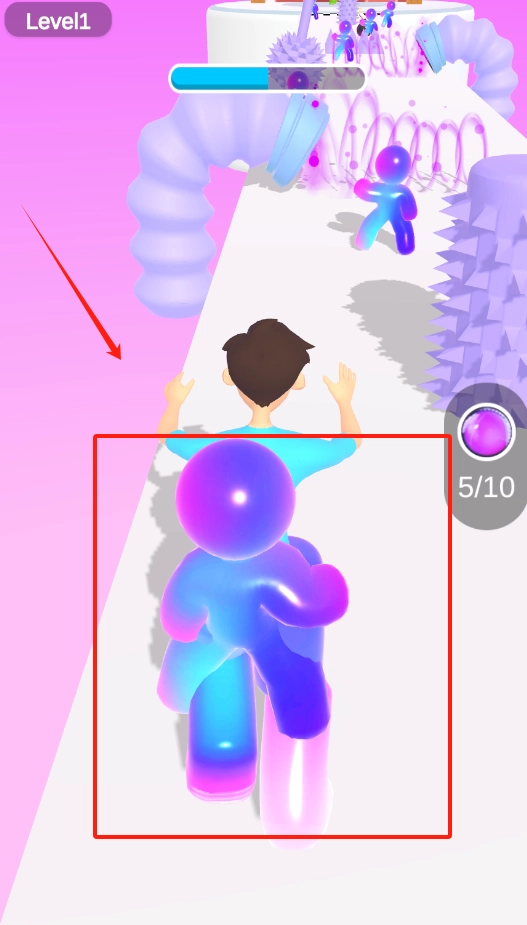 3、滑动屏幕控制果冻小人跑动,吃满10个彩色道具,注意别掉出白色跑道。