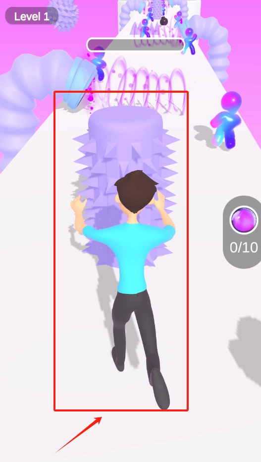 1、点屏幕左右两侧控制小人躲开紫色尖刺,跑到终点收集10个彩色道具。