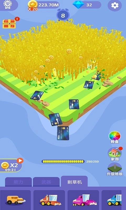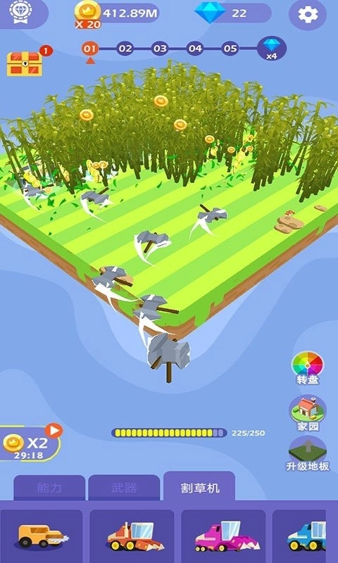 3、注意收集隐藏在草丛中的水果蔬菜等道具,获取额外奖励,解锁更多割草机与升级。