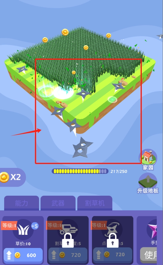 3、点击下方功能区升级割草机和能力,提升效率,割更多草赚更多钱。