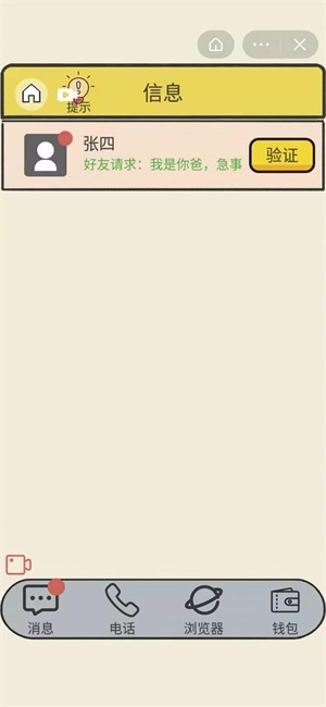 无论是青少年,还是各个年龄段的玩家,都适合玩这款游戏。大家能在娱乐过程中,不断增长识别骗局、防范诈骗的技能。《聊天的艺术》无疑是一款将教育与娱乐完美结合、极具现实意义的反诈手游精品之作!1、打开游戏,点击验证“张四”好友申请;