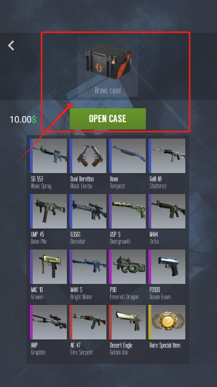 1、点红框里的Bravo箱子,花10美元就能开箱抽武器皮肤。