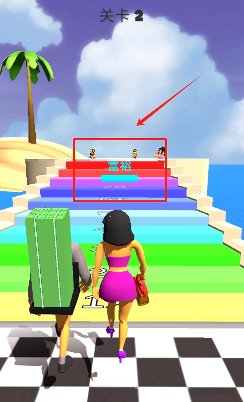3、操控角色走上彩色阶梯,靠近喜搭平台,和上面的人物互动完成任务。