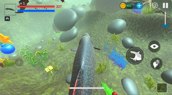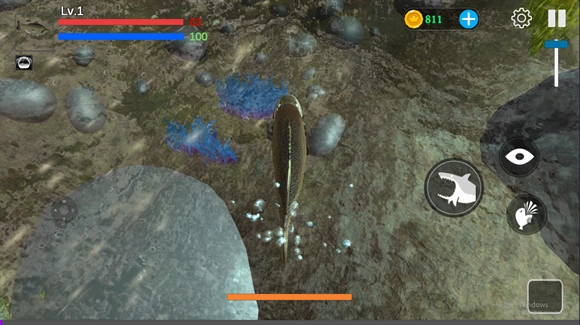3、探索与捕猎:玩家能够在水中畅快游动,捕杀其他动物,获取更多能量。