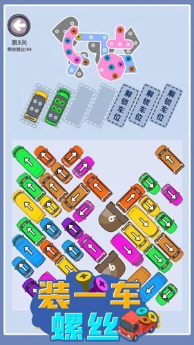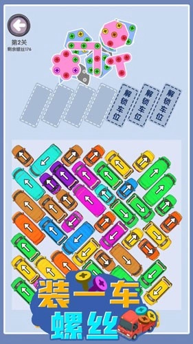 《装一车螺丝》是一款别出心裁的休闲益智闯关游戏,巧妙融合了挪车与颜色匹配的独特机制。在游戏里,玩家只需轻点屏幕,就能操控车辆移动,去收集与之颜色对应的螺丝。其核心玩法的关键,在于仔细观察车辆颜色与螺丝配色之间的联系,进而合理规划车辆的移动路线,如此一来,同色的螺丝便会自动飞入车厢之中。贴心的箭头标记,清晰指示着车辆的移动方向,每次点击就能完成车辆的位移,极大地简化了操作流程。当螺丝飞入车厢时,不仅伴有生动的动画效果,还搭配着清脆悦耳的音效,为玩家带来解压又愉悦的反馈体验。这种复合式的玩法设计,既需要玩家进行策略性的思考,又兼顾了操作上的便捷性,为玩家打造了别具一格的游戏乐趣。
