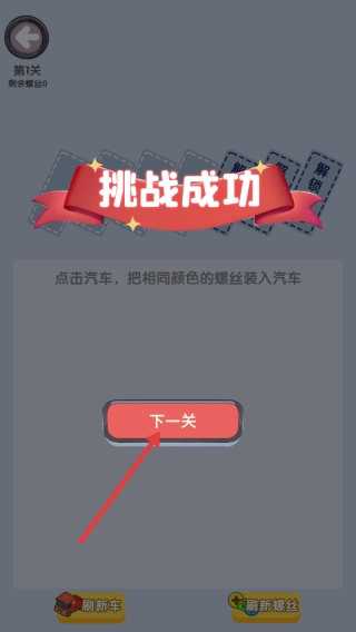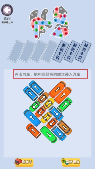 2、在关卡中,依照提示【点击汽车,将相同颜色的螺丝安装到汽车上】,完成相应操作。