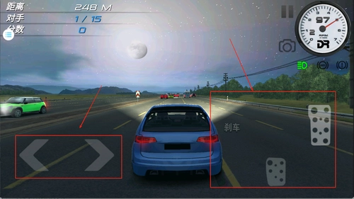 2. 车辆的转向及行驶方向由左侧进行控制,右侧设置的是加速与刹车按钮。界面上会展示当前速度、排名以及剩余路程等信息。