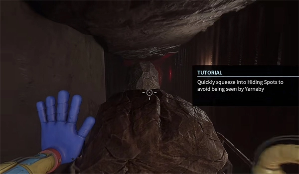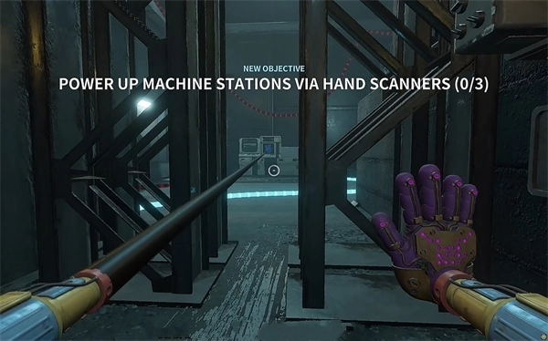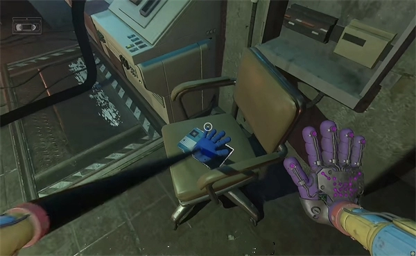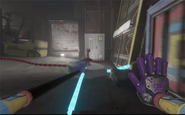 6、打开门后,进入里面会看到一个开关,把它拉下来。接着继续向前走,用蓝色手臂与前方的开关进行互动。注意,这里需要触发三个开关,才能产生电流打通出口。