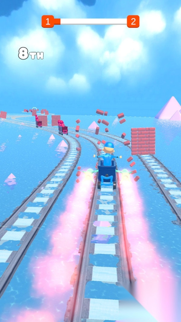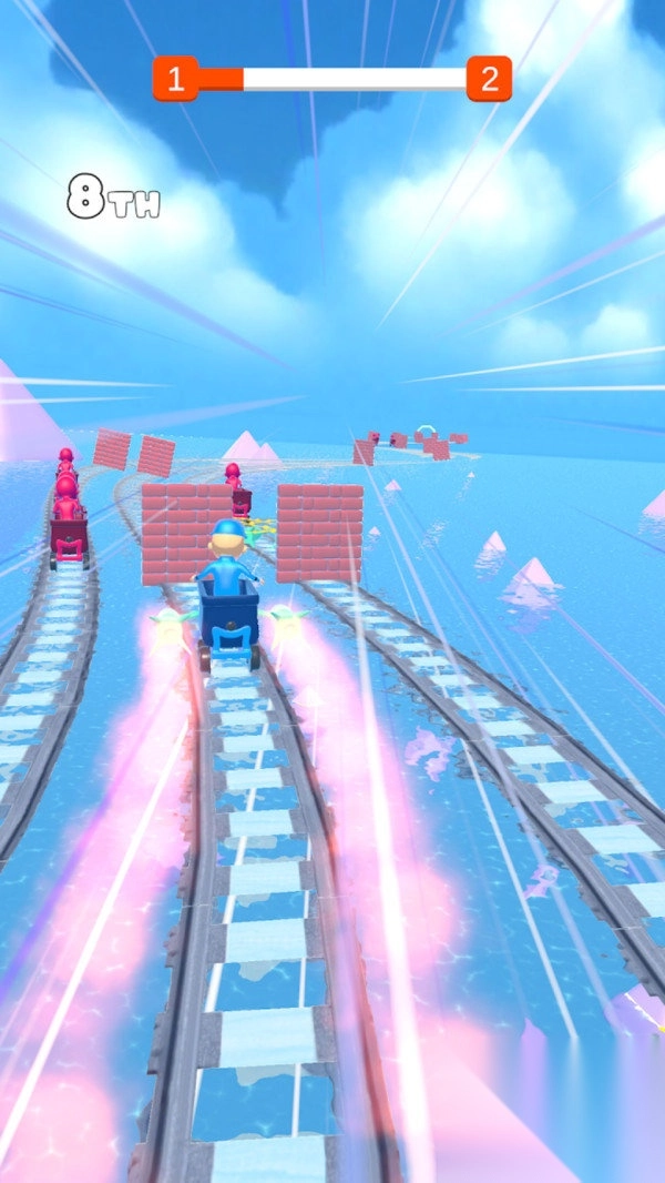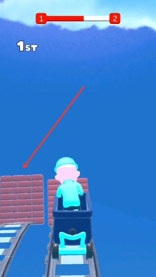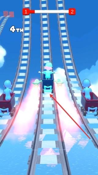 2、吃加速道具(火箭图标),提升速度,超对手(红色车厢),抢“1st”排名。