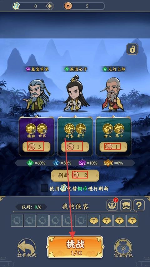1. 在侠客选择页面,能够看到诸如【慕容前辈、燕国公子、无灯大师】之类的侠客,通过消耗铜币进行刷新操作,点击【挑战】即可开启第1关。