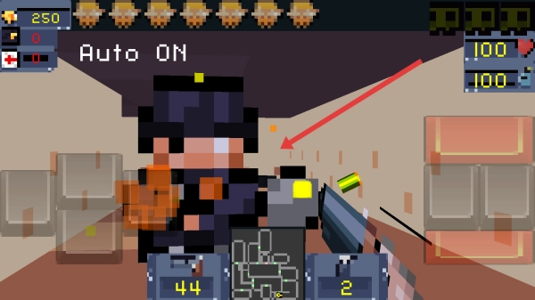 3、战斗中,操控像素角色(持枪士兵),沿箭头方向移动、射击,清理敌人,推进迷宫关卡。