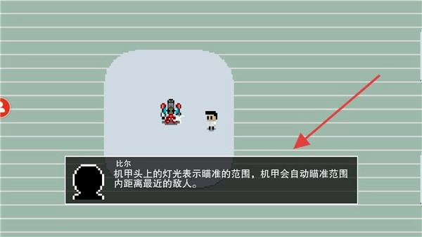 2、游戏引导,比尔讲解机甲瞄准机制,灯光示瞄准范围,机瞄自动锁最近敌人,学习战斗操作。