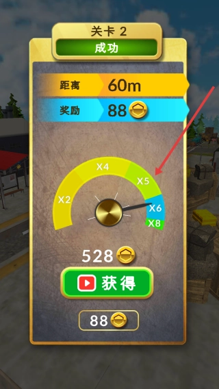 3、完成关卡,根据结算选【88】或看视频获奖励。
