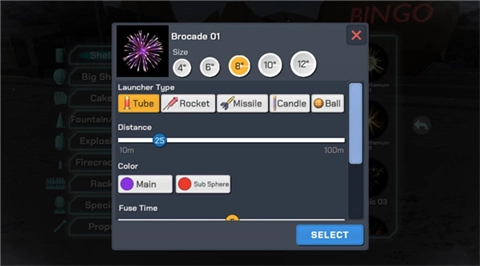 4、当我们挑选其中一个并点击后,便会弹出这样一个界面。在此界面中,能够对烟花的大小、发射器的类型、烟花发射的距离以及烟花引线燃烧的时间等进行选择。