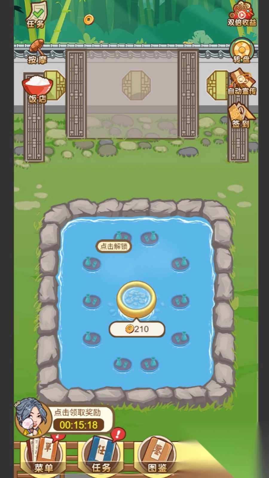 3、完成任务栏目标,获取奖励,用奖励解锁新场景员工,拓展经营规模,让澡堂更有名。