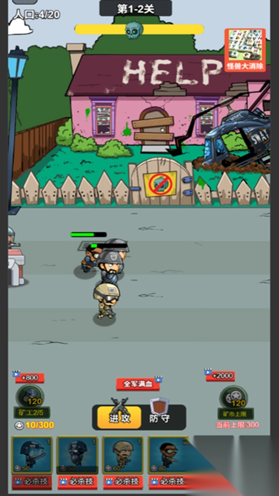 2、优先进行群体伤害技能的强化,比如炸弹洗地。当怪兽聚集在一起的时候释放该技能,能够清理一波怪兽,从而减轻士兵的压力。
