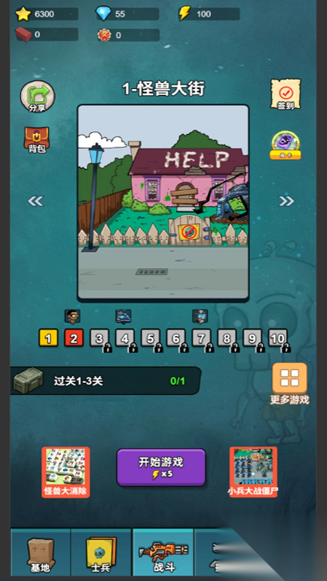 1、选关卡如怪兽大街,点击开始游戏,消耗闪电派士兵出战,拦截路上怪兽。