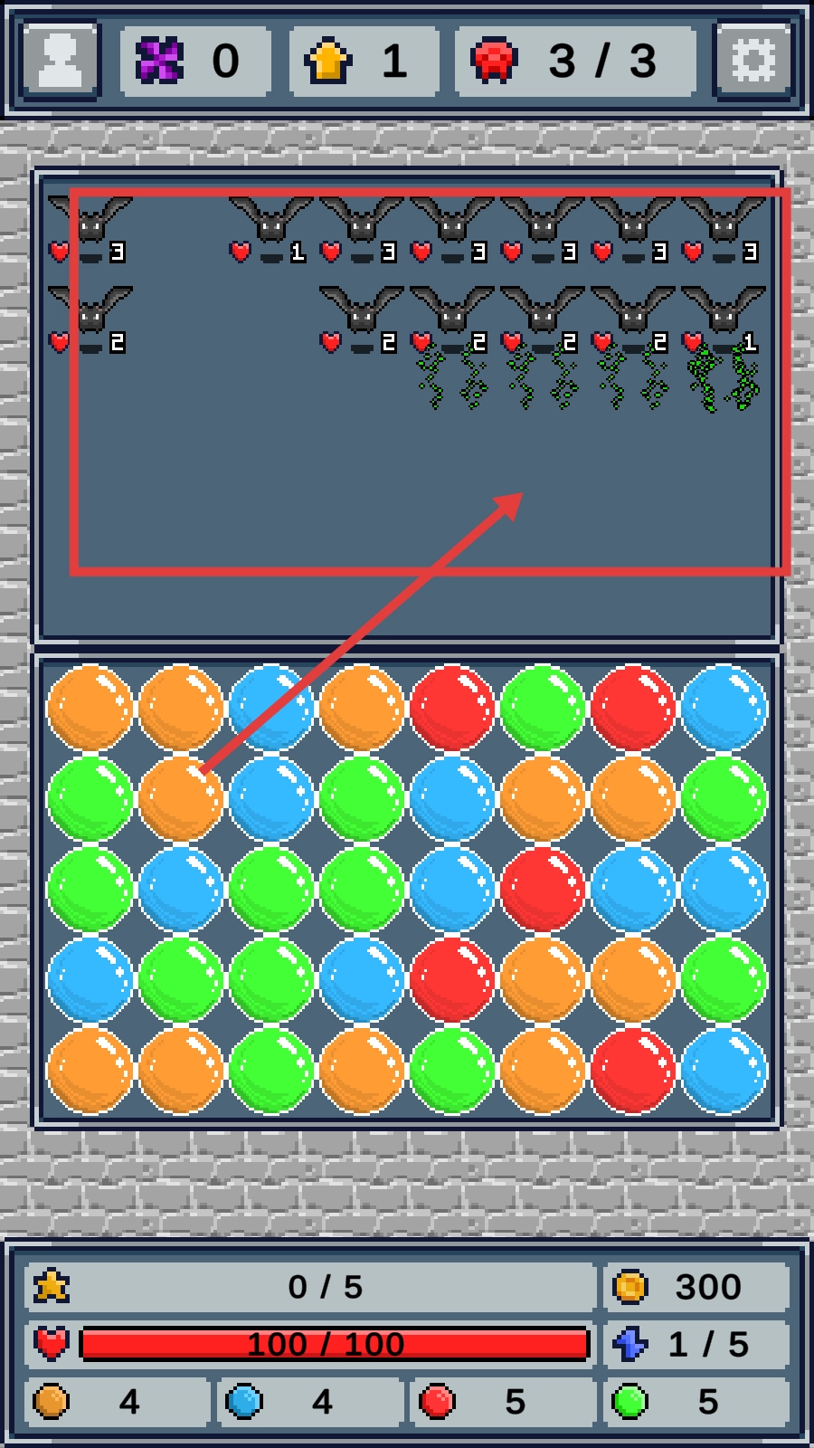 1. 开启游戏后,选择初始关卡。当遭遇首个敌人时,在屏幕上找到相连的3个火元素球,通过双击来完成消除操作,进而触发攻击,命中敌人并使其损失部分血量。