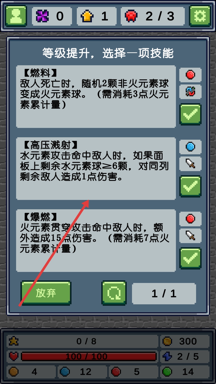 2、闯关进行到中期,当积累了足够经验升至2级时,可从“范围消除”“伤害加成”“体力恢复”这三个技能里挑选一个,借助新选的技能来助力消除更多的元素球。