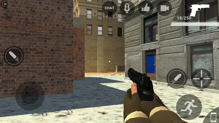 4、进入游戏之后,你可以先点击“chat”来展开对话。在操作方面,左边的圆圈用于控制前进或后退,右边的则用来控制蹲下与跳跃。