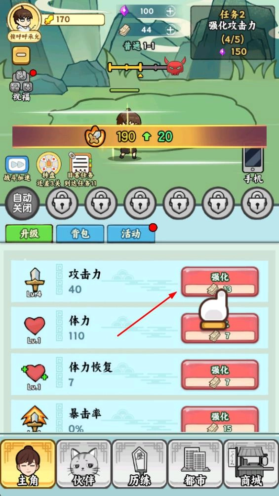 1. 于升级界面处,轻点强化按钮,以此提升攻击力、体力等各项属性,过程中会消耗相应道具或资源,进而增强角色的战斗能力,为关卡挑战做好准备。