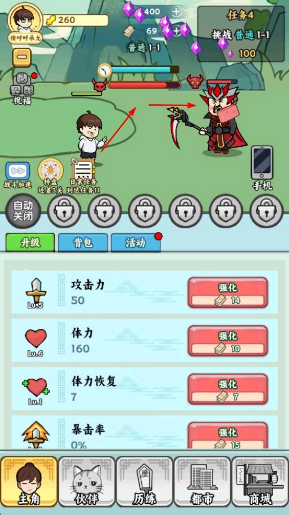 2、当进入诸如普通1 - 1、1 - 4这类关卡后,通过操控角色与敌人展开战斗,借助强化后的角色属性来战胜对手,从而推动关卡进度,并获取相应的战斗奖励。