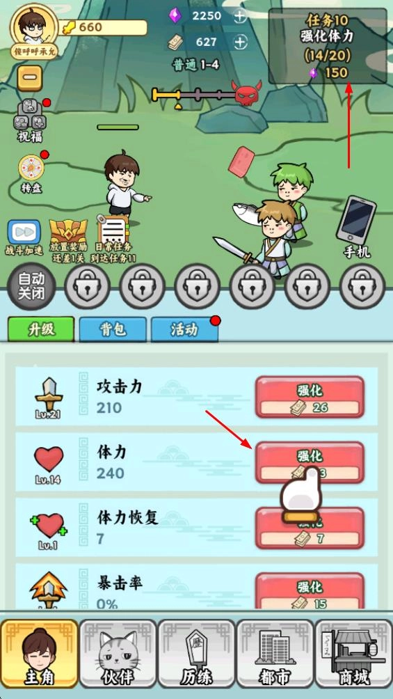 3、留意右上角的任务,诸如强化攻击力、体力等。只要达成任务要求,就能获取额外奖励,助力角色实现更深度的养成,解锁更多游戏内容。