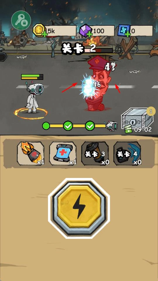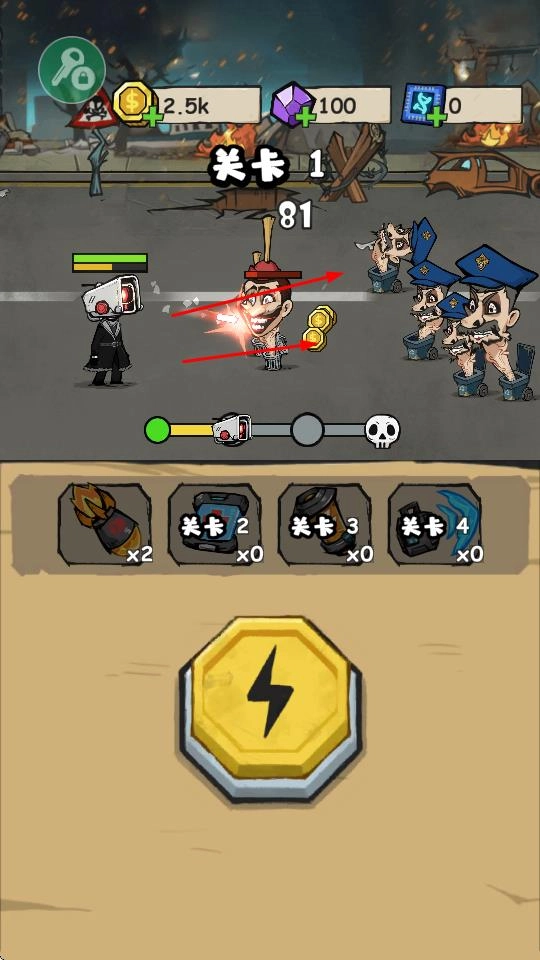 4、当处于关卡2,遭遇更为强大的敌人时,要合理使用攻击手段与道具,通过持续战斗来获取更丰厚的收益,与此同时,还能解锁更多的关卡以及游戏内容。
