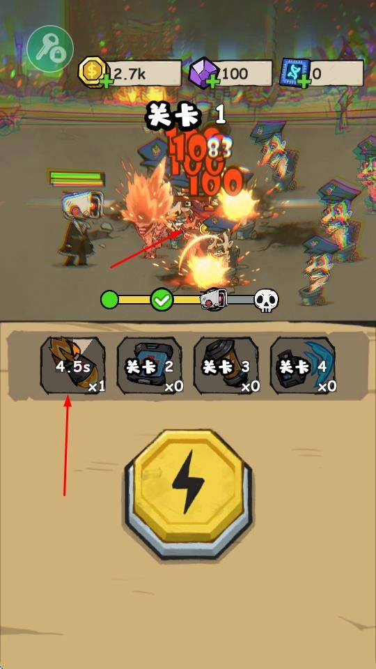 1当踏入关卡1,玩家需操控角色与敌人进行战斗。在战斗过程中,通过对敌人发起攻击来积攒能量,与此同时,还能够获取金币奖励,以此为后续的游戏进程储备资源。