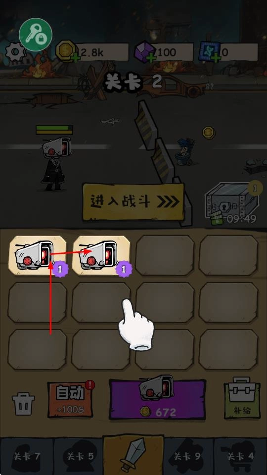 3、当完成关卡1后,关卡2便会解锁。此时,只需点击“进入战斗”按钮,就能开启全新的战斗挑战。此外,你还能够通过搭配不同的战斗单位,来提升自身的战力。