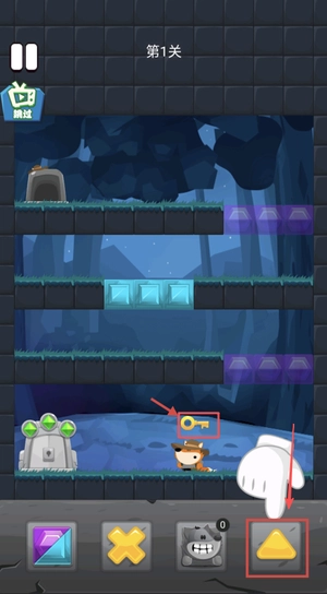3、当物品层层掉落后,我们要操控狐狸去收集黄色钥匙。只需点击下方的黄色三角形按钮,就能助力狐狸跳跃,获取钥匙后打开门。