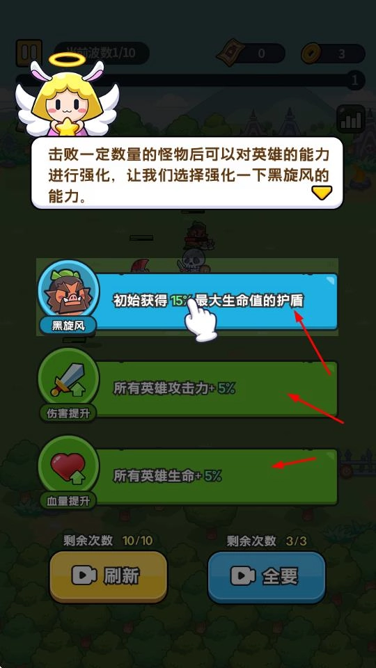 4、在成功击败一定数量的怪物之后,玩家便拥有对英雄能力进行强化的机会。强化选项包括提升单个英雄或者全体英雄的攻击力、生命值等属性,以此来增强队伍的续航能力与输出能力。