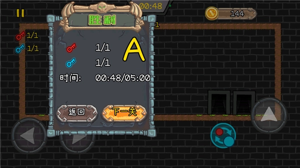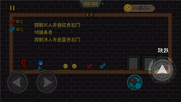 4、接着,向上的按钮能实现跳跃。你要做的是操控火人打开红色石门,过程中还有切换角色的操作,切换后操控病人打开蓝色石门。