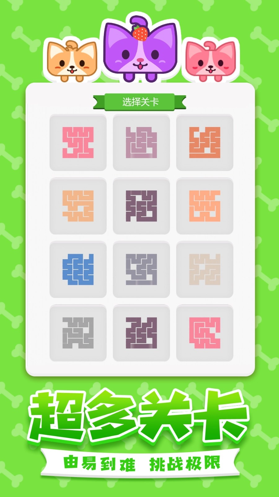 游戏设有大量关卡等你来解锁,难度循序渐进,多达数百关。越往后,关卡难度越高,玩家需要多花时间,认真思考,才能一笔画完成所有任务,并让汪星人把整个关卡涂满颜色。