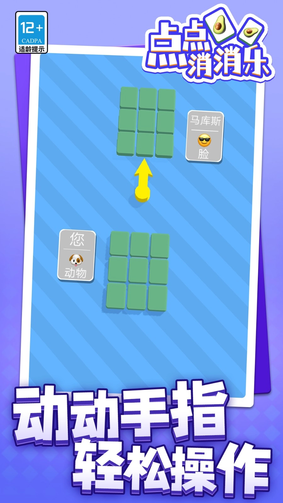 点点消消乐,一款超好玩的休闲益智游戏。它有着精美舒适的画面风格,搭配欢快的背景音乐,完美营造出轻松的挑战氛围。有趣的休闲玩法,大大增强了游戏的可玩性,玩家能自由开启挑战。玩法很简单,玩家只需把相同图案的方块放进方框就能消除,消除速度越快得分越高。当场上所有元素都被消除,就能迅速取胜,带来超有意思的休闲闯关体验。而且后期还增添了各类关卡等你解锁,想玩随时就能加入。快节奏的消除过程,助你赢得超高分数,顺利完成挑战。感兴趣的玩家千万别错过,随时随地都能尽情畅玩。