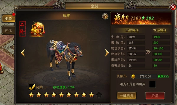 1. 提升坐骑阶位能够解锁全新外观,还会增加基础属性。