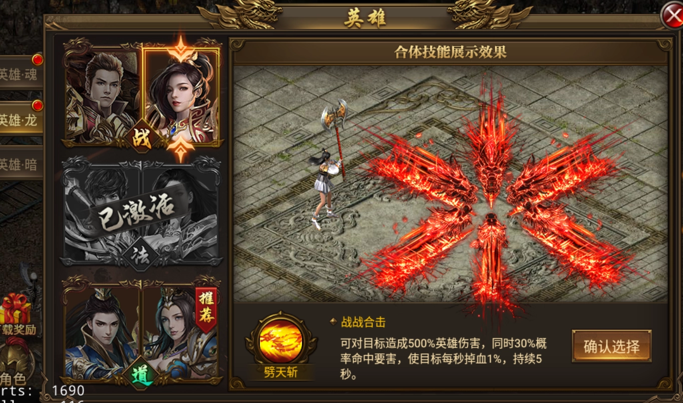 最多能够携带三位英雄,每位英雄具备诸如战法道之类各不相同的属性,合击技能会自动解锁。