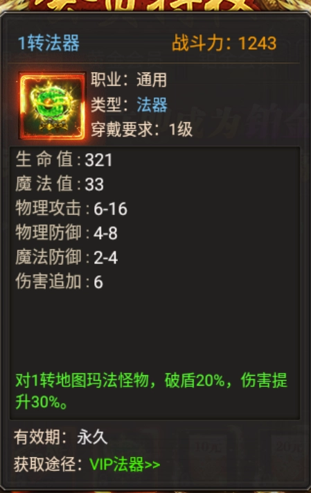 c. 在前期,法器能够大幅提升对玛法怪物的伤害,加快刷怪速度。而且在前期,通过会员特权就能免费领取法器。