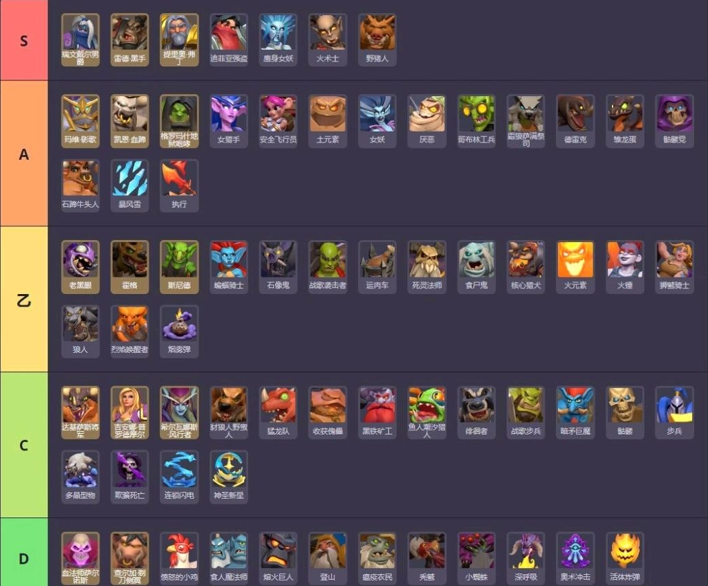 爆裂龙蛋、隐匿飞机、淬毒刀盗贼、带毒爪鹰身人、回血女妖灵、凝冻暴风雪、裂变土元素、披甲豺狼人、嗜血猛斩、范围型蝙蝠骑士、产蛋幼龙、远射程狮鹫